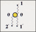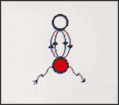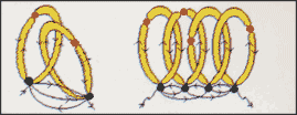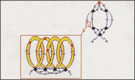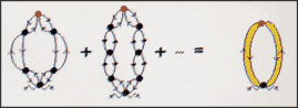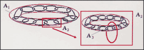 Среди траекторий виртуального фотона, возвращающегося к той или иной частице с учетом присутствия бесконечного числа виртуальных частиц, есть траектории, похожие на петлю, составленную из двух частей, как кольцо наручников. Два полукольца на рис. 10 – они не обязательно одинаковые – смыкаются у верхней частицы, выделенной цветом. Сумма таких петель обозначена нами тонированным кольцом. В процессе своего движения эти кольца траектории могут переплетаться (рис. 11). В свою очередь каждая пропагаторная линия, из которых состоят переплетенные кольца, показанные на рис. 11, также есть набор переплетенных колец меньшего масштаба (рис. 12). Так повторяется до бесконечности. Таким образом, структура фотонной траектории в рассматриваемой задаче повторяет топологию антуановского ожерелья.