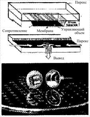 Институт микротехнологии (г. Майнц) разработал мембранный насос (рис. 11), при изготовлении которого был использован широкий спектр микросистемных технологий (LIGA, тонкопленочная технология, пластиковая микроштамповка и др.). Производительность насоса может контролироваться с высокой точностью и достигает 300 мл/мин. Материал, из которого он изготовлен, может обладать биологической совместимостью. Насос работает в импульсном режиме и имеет значительный ресурс (109 циклов). Еще одним преимуществом этой конструкции является его способность к самозаполнению (создаваемое разряжение 350 гПа).
