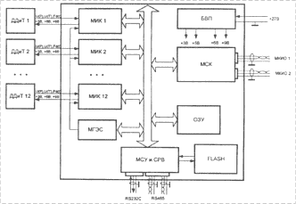 Ослабить эти недостатки можно при построении РИИС в виде объединенных сетью многоканальных многофункциональных модульных информационно-измерительных систем (МИИС). На рис. 3 приведена ориентированная на измерения давления и температуры 12-канальная МИИС.